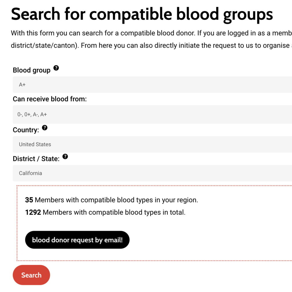 Very important: please fill in the information we need. It is absolutely useless if you become a member but do not tell us your blood type or how and where you can be reached. You will be entered into a (completely anonymous) database where we and you can search for potential blood donors – if there is no information in there, the whole thing won’t work. However, if you don’t know your blood type right now, no problem, you can become a member now and add it later.