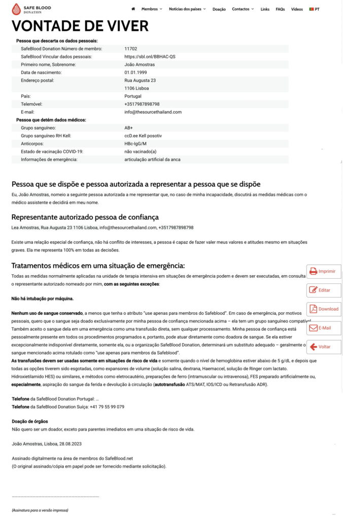 Esta é um exemplo de um testamento vital. Se quiser um seu, aceda ao login como membro, onde pode modificar este documento como desejar. Ou pode tornar-se um membro aqui. Assim, não só terá o seu próprio testamento e cartão de membro/grupo sanguíneo, como também um código individual que o pessoal médico pode utilizar em caso de emergência – com todos os seus dados médicos.